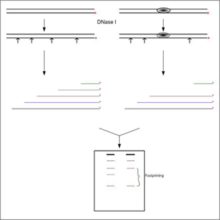 Le principe du footprinting repose sur la capacité qu’ont les protéines à se fixer sur l’ADN. Tu marques tes fragments d’ADN d’intérêt avec un groupement phosphate radioactif et tu réalises une digestion partielle avec une DNAse (ex : DNAseI). Tu réalises cette expérience sans extrait protéique qui te sert de contrôle et avec un extrait protéique ou une protéine purifiée qui constitue ton foot printing. Si une protéine est capable de se fixer sur ta séquence d’ADN, elle va le protéger de la dégradation. En comparant les différents fragments obtenus après migration sur gel tu pourras alors savoir si une protéine est capable de se fixer sur l’ADN (voir dessin). Des expériences de retard sur gel sont également utilisées pour savoir si une protéine se fixe sur un acide nucléique.